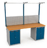 На верстак установлен Экран перфорированный (Э1). В нижнюю часть экрана по желанию устанавливается короб для коммуникаций. На экран с помощью зацепов легко устанавливаются полки и другие аксессуары. Максимальная нагрузка на Экран — 100 кг.
