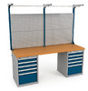 На верстак установлен Экран перфорированный (Э3). В нижнюю часть экрана по желанию устанавливается короб для коммуникаций. На экран с помощью зацепов легко устанавливаются полки и другие аксессуары. Максимальная нагрузка на Экран — 100 кг.