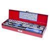 Набор слесарного ручного инструмента профессионального качества King Tony 8410MP с присоединительным квадратом 1 дюйм включает в себя 8 ударных торцевых головок с рабочими размерами от 17 до 41 мм, размещённые в металлическом кейсе с габаритами 445x120x68 мм. Слесарный ручной инструмент: • головки ударные торцевые четырёхгранные: 17, 21 мм; • головки ударные тонкостенные торцевые шестигранные: 24, 27, 32, 36, 38, 41 мм. Набор инструментов ударных торцевых головок 1 дюйм 17-41 мм, 8 предметов King Tony 8408MP предназначен для использования как на станциях технического обслуживания автомобилей и т. п. предприятиях, так и в частных гаражах. Весь инструмент марки King Tony изготовлен из высококачественной легированной хром-ванадиевой стали и способен выдерживать высокие нагрузки.