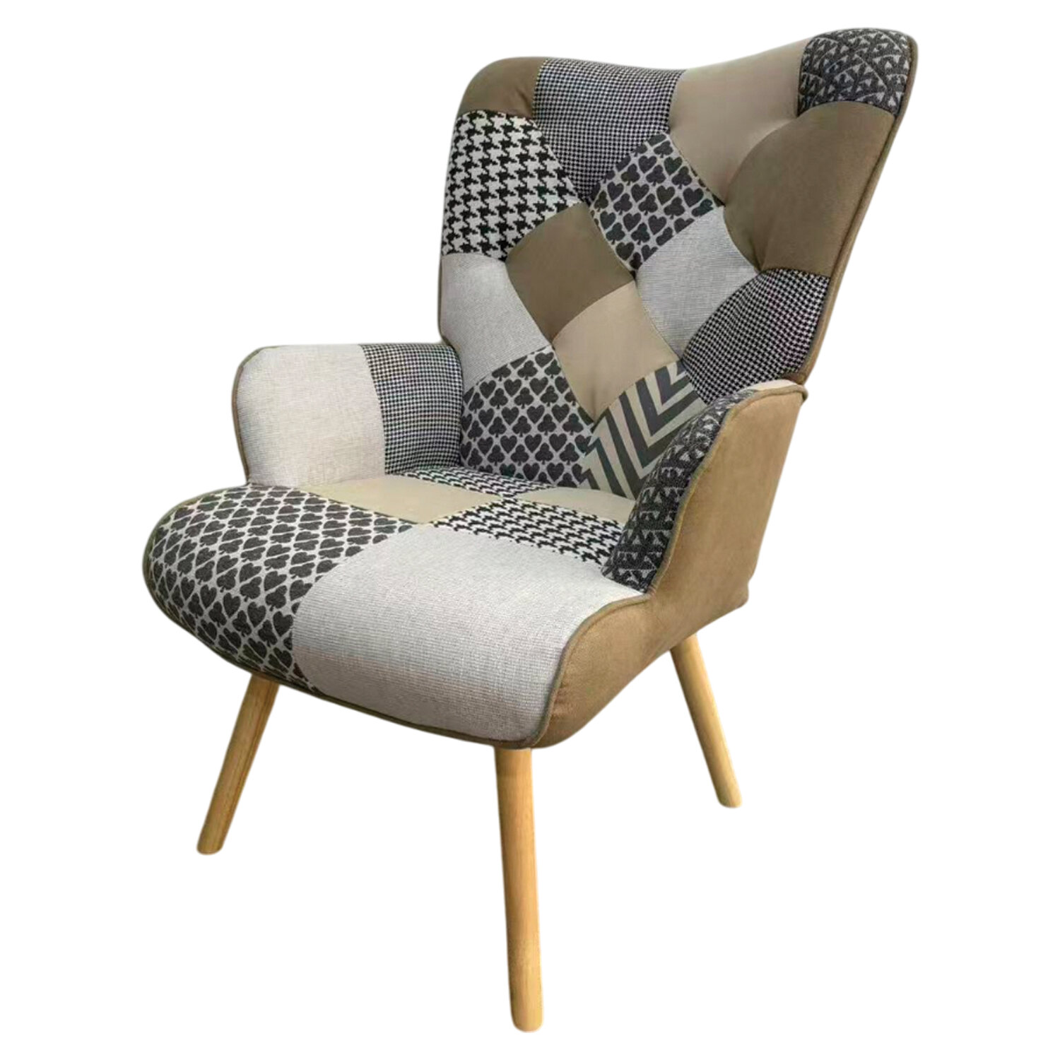 Обивка кресла выполнена из ткани с принтом в виде лоскутов. Она имеет приятные тактильные качества, легко чистится и хорошо пропускает воздух.В качестве набивки использован качественный мягкий поролон.