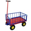 Прочная стальная конструкция, сваренная из стальных профилированных труб. Колеса литые или пневматические. Поворотный узел выполнен на опорном подшипнике. Платформа универсальная, съемная, крепится на 4-х болтах с полукруглой головкой. Борта изготовлены из профильной трубы 20х20. Заполнение бортов возможно как сеткой 50х50, так и трубкой диаметром 10 мм. Все борта съемные, высота 300 мм. Порошковая окраска.